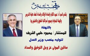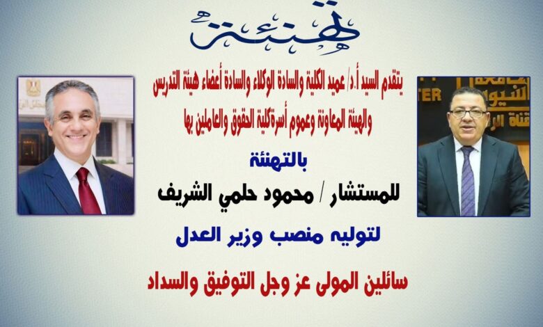 تقدم الأستاذ الدكتور دويب حسين صابر، عميد كلية الحقوق بجامعة أسيوط، والمستشار القانوني لرئيس الجآمعة والسادة الوكلاء والسادة اعضاء هيئة التدريس بخالص التهنئة وأصدق التبريكات إلى معالي المستشار الدكتور/ محمود حلمي الشريف، بمناسبة صدور القرار الجمهوري بتعيينه وزيرًا للعدل في الحكومة الجديدة، متمنيًا لسيادته دوام التوفيق والسداد في أداء رسالته الوطنية السامية، واستكمال مسيرة تطوير منظومة العدالة وترسيخ سيادة القانون…وقد أعرب عميد الكلية عن بالغ فخره واعتزازه بأن معالي وزير العدل هو أحد خريجي كلية الحقوق – جامعة أسيوط، مؤكدًا أن هذا التعيين يعكس المكانة العلمية المتميزة للكلية ودورها الرائد في إعداد رجال القضاء والقانون الذين يتولون أرفع المناصب في الدولة.